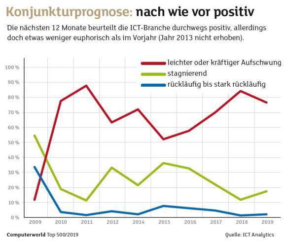 Mit diesen Werten waren die Schweizer ICT-Firmen damals so optimistisch wie schon lange nicht mehr. Nur 2011, nach der überwundenen Finanzkrise, lag die Prozentzahl noch höher.