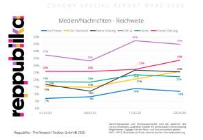 Unter den inländischen Nachrichten/Medien-Websites verzeichneten die „Kleine Zeitung“ (+82 Prozent oder +12 Prozentpunkte), „Der Standard“ (+ 54 Prozent oder +8 Prozentpunkte) und der ORF ( +31 Prozent oder +11 Prozentpunkte) den grössten Anstieg der Reichweite in der KW 11/12 im Vergleich zum Durchschnitt der beiden Vorwochen. Es folgten die Portale von „Kurier“, „Österreich“/oe24, „NÖN“, APA, Vienna Online, „BVZ“ und „Die Presse“, die allesamt eine Steigerung ihrer Reichweite um fünf Prozentpunkte oder mehr verzeichnen konnten. Das Portal des Bundesministeriums für Inneres war im Beobachtungszeitraum die beliebteste offizielle Quelle für Corona-Updates und hat seine Reichweite verdoppelt.