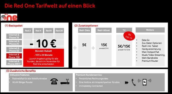 Die Bündelpakete beginnen bei knapp unter 50 Euro und umfassen allesamt Preisnachlässe gegenüber den üblichen Einzeltarifen. Zusätzliche Produkte und Zusatzkarten soll es unter Red One zu besonderen Konditionen geben, betont Vodafone.