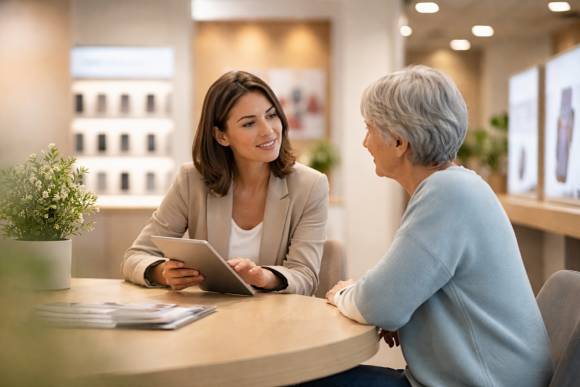 Ruhige Eins-zu-eins-Beratung im Shop: Gedämpftes Licht und eine entspannte Atmosphäre sollen Kundinnen und Kunden ein Gespräch ohne Zeitdruck und Ablenkung ermöglichen