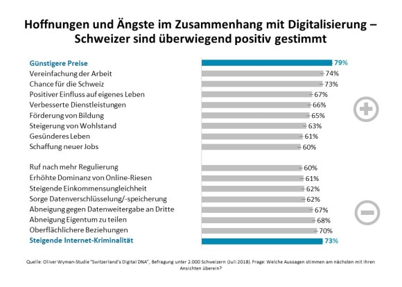 «Generell bleibt die Schweiz auch 2018 ein idealer Standort für Digitalunternehmen, denn die Bevölkerung stellt sich den Chancen sehr positiv, aber auch aufgeklärt gegenüber», sagt Joris D’Incà, Schweiz-Chef von Oliver Wyman. 73 Prozent sehen eine «Chance für die Schweiz», 67 Prozent einen «positiven Einfluss auf das eigene Leben». Im Vorjahr lagen diese Werte auf vergleichbaren hohen Niveau. «Das zeigt, dass die Schweizer parat sind für zukünftige Umstellungen, etwa dass klassische Jobs durch flexiblere Arbeitsmodelle ersetzt werden.»