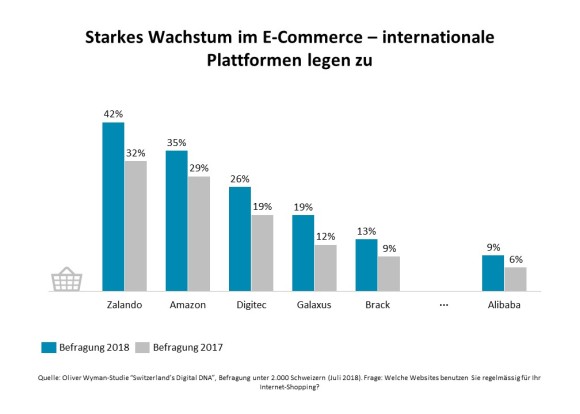 Gefragt nach dem überragenden Vorteil der Digitalisierung, setzen die Schweizer wie schon im Vorjahr die Konsumentenbrille auf: Sorgt das Internet für günstigere Preise beim Einkauf? 79 Prozent stimmen hier zu. Verstärkt nutzen die Schweizer den Kanal E-Commerce – und immer öfter landen sie bei den Platzhirschen: Zalando (von 32 auf 42 Prozent) und Amazon (von 29 auf 35) konnten im Jahresvergleich deutlich mehr regelmässige Nutzer gewinnen, so wie auch Digitec (von 19 auf 26 Prozent). Der chinesische Primus Alibaba kommt bereits auf 9 Prozent regelmässige Nutzer. «Wir gehen fest davon aus, dass die internationalen Plattformen weiter Fuss fassen werden», sagt Cavadini.