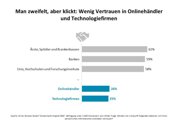 Man zweifelt, aber man klickt: Das Vertrauen in Technologiefirmen wie Google liegt mit 25 Prozent am untersten Ende der abgefragten Sektoren. Kaum besser ist der Leumund der Online-Händler wie Amazon, denen nur 26 Prozent ihr Vertrauen schenken, wenn es um personalisierte Angebote geht. 2017 erlangten Tech- und Onlineunternehmen ähnlich niedrige Vertrauenswerte. Spitzenwerte geniessen weiter Spitäler, Ärzte und Krankenkassen mit 61 Prozent, Banken mit 59 Prozent und Universitäten mit 58 Prozent.