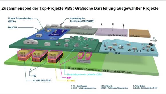 Die wichtigsten IKT-Vorhaben im VBS sind die DTI-Schlüsselprojekte Telekommunikation der Armee (TK A), Führungsnetz Schweiz (Fhr Netz CH), Neue Digitalisierungsplattform (NDP), ERP Systeme V/ar: Programm, iTASK (IT der Armee separieren und konzentrieren), Sicheres Datenverbundnetz plus (SDVN+), Polycom 2030 Werterhalt (WEP2030); Neue Produktionsplattform swisstopo (NEPRO).