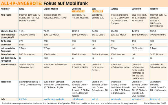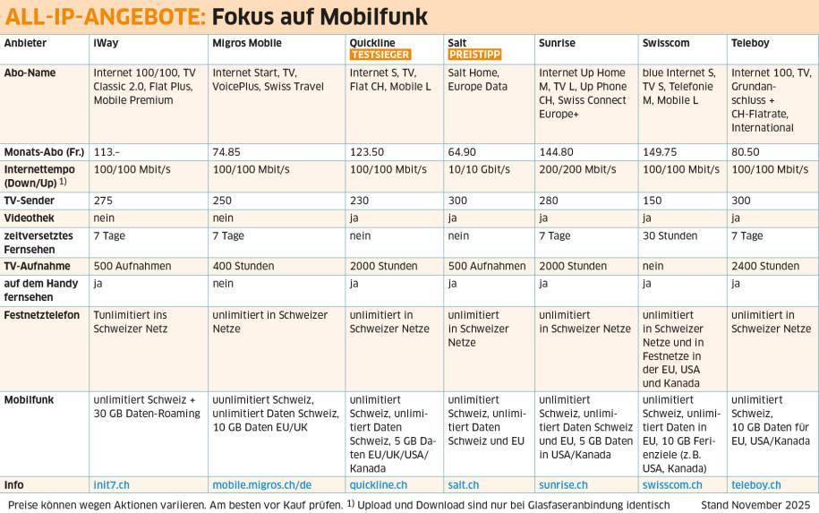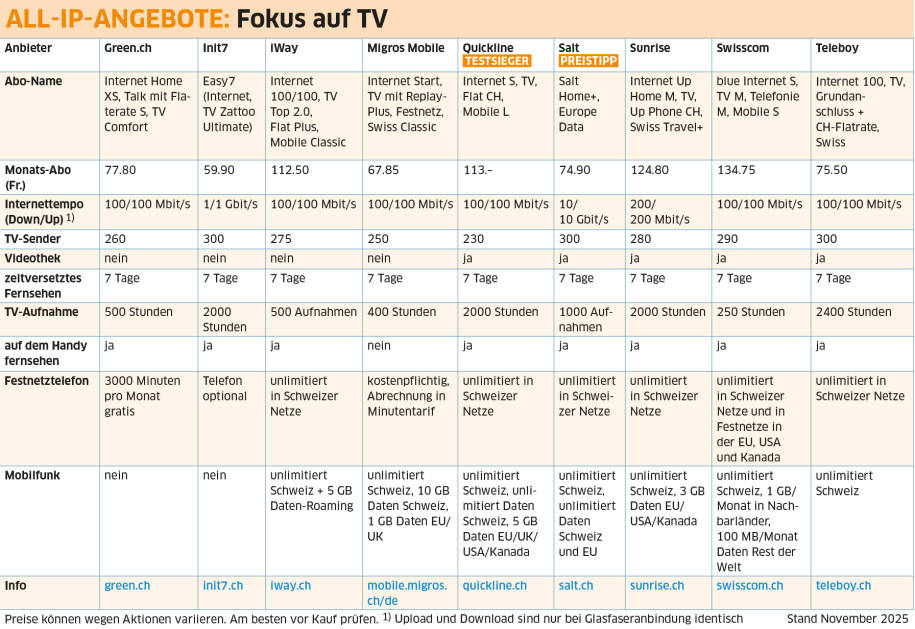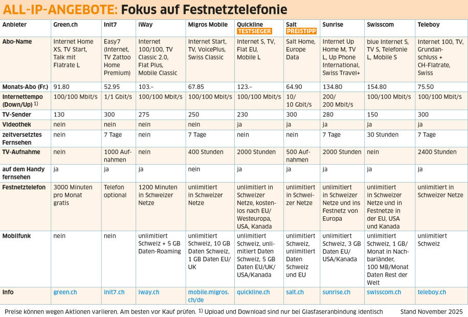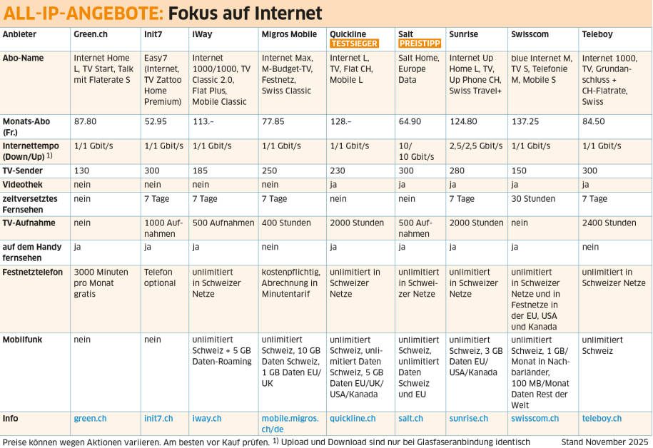 Die Preise der Provider sind im Vergleich zum Vorjahr in vielen Bereichen merklich gestiegen: Surfen, Fernsehen, Festnetztelefonie und Mobilfunk werden bei gleichbleibender Leistung und Geschwindigkeit teurer. Wer Komfort wie das Ausblenden von Werbung beim zeitversetzten Fernsehen wünscht, muss noch tiefer in die Tasche greifen. Doch es gibt auch Lichtblicke: Zwei Anbieter stechen besonders hervor: Quickline ist PCtipp-Testsieger, da dieser Provider in seinem Bestellprozess eine vorbildliche Preistransparenz bietet und gleichzeitig eine umfangreiche Auswahl an Konfigurationsmöglichkeiten bereithält. Für Anwender, die auf ein attraktives Preis-Leistungs-Verhältnis schauen, ohne auf wesentliche Funktionen verzichten zu wollen, bietet sich Salt an. Unser Preistipp schnürt ein Gesamtpaket, das Internet, TV, Mobilfunk und Festnetztelefonie zu einem attraktiven Preis bündelt.