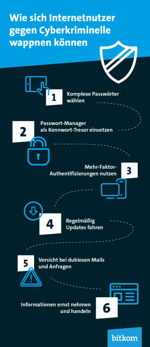 Laut Bitkom schützen diese sechs Tipps vor Cyberkriminalität: User sollten komplexe Passwörter, die mindestens acht Zeichen lang sind und sowohl Gross- und Kleinbuchstaben als auch Ziffern und Sonderzeichen enthalten, verwenden. Zudem sollte das Passwort kein Begriff sein, der im Wörterbuch steht und keinen Bezug zum beruflichen oder privaten Umfeld haben. Eine weitere Möglichekeit ist den Passwort-Manager als Kennwort-Tresor einzusetzen. Der Passwort-Manager generiert komplexe Passwörter und hebt diese sicher auf. Zudem bietet die Mehr-Faktor-Authentifizierung mehr Sicherheit: Beim Einloggen gibt man das Passwort ein, anschliessend bekommt man eine TAN per SMS. Auch regelmässige Updates schützen vor Viren und Schadsoftware, denn Sicherheitslücken sind häufig Programmierfehler, durch die sich Viren und Schadsoftware Zugang zu den Daten verschaffen. Die Sicherheitsupdates schliessen diese Lücken. Besondere Vorsicht ist bei dubiosen E-Mails und Anfragen geboten: Banken und andere Unternehmen bitten ihre Kunden nie per E-Mail, vertrauliche Daten im Netz einzugeben. Diese Mails sind am besten sofort zu löschen. Das Gleiche gilt für E-Mails mit unbekanntem Dateianhang oder verdächtigen Anfragen in sozialen Netzwerken. Wenn über Sicherheitslücken, Hacks oder ähnliche Vorfälle berichtet wird, sollten Nutzer handeln. Um an Informationen zu kommen, können Nutzer beispielsweise Apps wie das Sicherheitsbarometer von DSIN einsetzen.
