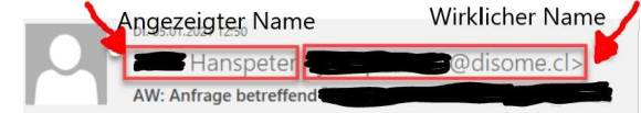 Besonders fies an der Masche: Bei vielen dieser Mails handelt es sich laut Polizeiangaben um wirklich verschickte Mails, die den Betrügern in die Hände gefallen sind und nun durch sie erneut versandt werden. Die Fälschung könne aber erkannt werden, da der angezeigte Name nicht dem wirklichen Namen entspreche (vgl. folgenden Screenshot).
