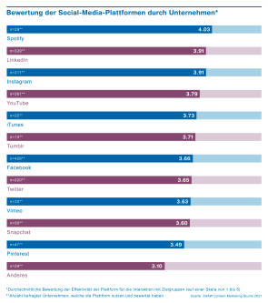 Bei der Bewertung der Effektivität von Social-Media-Plattformen durch die Unternehmen schneiden so gut wie alle positiv ab, wobei der Nischenkanal Spotify mit einem Wert von 4.03 (von 5) das beste Resultat erzielt. Allerdings nutzen ihn nur etwa vier Prozent der Unternehmen. Von den grösseren Anbietern stechen insbesondere LinkedIn und Instagram hervor. Daneben werden auch Facebook und Twitter als effektive Distributionskanäle gesehen.