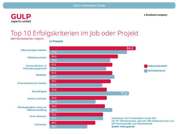 Auch die befragten Festangestellten schätzen die Lage ähnlich ein. Diese nannten auf die Frage «Was ist wichtig, um in Festanstellung erfolgreich zu sein?» ebenfalls die Punkte der Freelancer, hatten jedoch eine andere Topantwort. In Arbeitnehmerkreisen wird die «Teamfähigkeit» mit 77,4 Prozent der Stimmen als wichtigste Eigenschaft empfunden. Zudem gehört die «Stress-Resistenz» zu einer der häufigsten Antworten mit 61,1 Prozent. Das «Fachwissen» lag hier lediglich auf Platz elf.