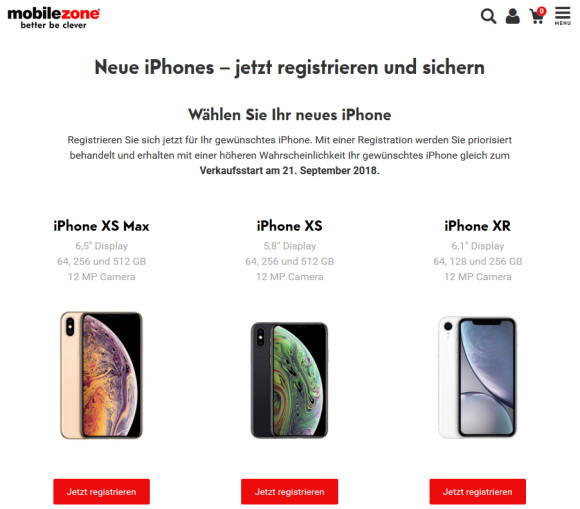 Ab sofort können sich Kunden bei mobilezone das iPhone XS, iPhone XS Max und iPhone XR sichern. Die kostenlose Registrierung ist unter www.mobilezone.ch/neue-iphones oder in einem der über 120 mobilezone-Shops möglich.