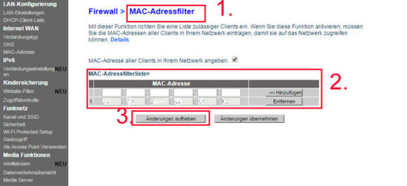 Unter Umständen hat ein anderer Nutzer, oder Sie selbst, aus Sicherheitsgründen den MAC-Filter aktiviert. Die MAC-Adresse (Media Access Control Adress) ist eine fixe einmalige Hardware-Adresse von jedem Netzwerkgerät. Im Menü der meisten gängigen WLAN-Router lassen sich die MAC-Adressen jedes mit dem Router verbundenen Geräts eintragen. Dies hat den Vorteil, dass sich Geräte, die nicht auf der Liste stehen, gar nicht erst über diesen Router mit dem Netzwerk verbinden können. Möchten Sie nun diese Liste ergänzen oder den Filter ganz deaktivieren, müssen Sie das im Menü des Routers tun. Dieses Menü erreichen Sie in aller Regel, indem Sie Ihren Browser starten und die IP-Adresse Ihres Routers eingeben (standardmässig 192.168.0.1 oder 192.168.1.1). Dort klicken Sie auf den Menüpunkt MAC-Adressenfilter (1) (wo sich dieser Punkt befindet und wie er heisst, unterscheidet sich von Router zu Router). Dort lassen sich die zusätzlichen MAC-Adressen (oft an der Unterseite des Endgeräts auf einem Sticker notiert), eingeben (2) oder die Filterfunktion deaktivieren (3).