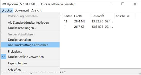 Bild 6: Über das Druckermenü in Windows brechen Sie auch mehrere hängende Druckaufträge schnell und bequem auf einmal ab