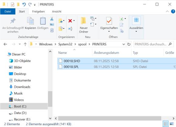 Öffnen Sie jetzt mit den beiden Tasten Windowstaste+ E ein Fenster des Windows-Explorers und navigieren Sie in den Ordner C:\Windows\System32\spool\PRINTERS. Löschen Sie alle in ihm enthaltenen Dateien, Bild 8. Klicken Sie danach im Dienste-Fenster erneut mit der rechten Maustaste auf den Eintrag Druckerwarteschlange und wählen Sie dieses Mal den Befehl Starten aus dem Kontextmenü aus.
