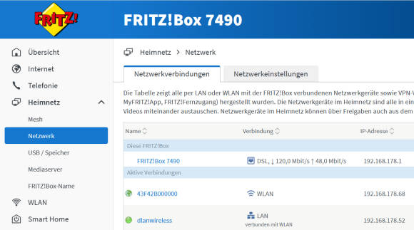 Bild 7: Sie finden den Drucker mitsamt IP-Adresse in den Netzwerkverbindungen Ihres Routers; aussagekräftige Namen sind hilfreich