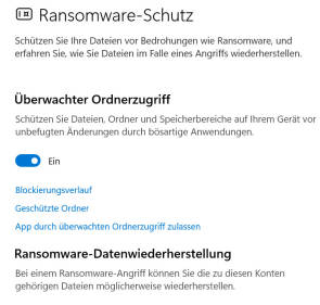 Nicht standardmässig eingeschaltet ist der Schutz vor Ransomware – eine Angriffsform, bei der Daten auf dem Gerät verschlüsselt werden. Die Daten werden nur nach Zahlung eines Lösegelds wieder freigegeben. Daher der Name «Ransom», der für «Erpressung» steht. Diese Art von Angriffen hat in den vergangenen Jahren stark zugenommen. Grösstenteils stecken kriminelle Banden dahinter, die mit dieser Methode Geld verdienen.