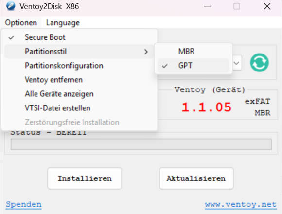 Normalerweise richtet Ventoy Ihren USB-Stick mit einem klassischen MBR (Master Boot Record) sowie Unterstützung von Secure Boot ein. Diese Sicherheitsfunktion verhindert, dass nicht offiziell signierte Systeme starten und möglicherweise eine Malware einschleppen. Viele Linux-Distributionen und auch Ventoy haben aber keine solche Signatur. Probleme sind daher vorprogrammiert.