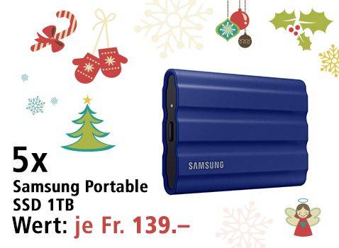 Im Adventskalender 2025 verlosen die Kollegen vom PCtipp auch dieses Jahr wieder tolle Preise. Dazu gehören die fünf Portable SSD T7 Shield 1TB von Samsung.