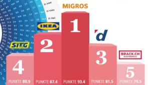 Die Firegroup hat die Social-Media-Auftritte der 50 wichtigsten Schweizer Detailhändler analysiert. Die Grosskonzerne Migros mit dem ersten Platz und Ikea auf Platz zwei sind ganz vorne. Doch dann folgen bereits Digitec, Steg Electronics und Brack auf den Plätzen drei, vier und fünf. Untersucht wurde, wie die Schweizer Detailhändler die verschiedenen Social Media-Kanäle nutzen. Weil Digitec, Steg und Brack gemäss der Studie keine Apps haben, verschenken sie wertvolle Punkte und erhalten in dieser Kategorie Null Punkte.