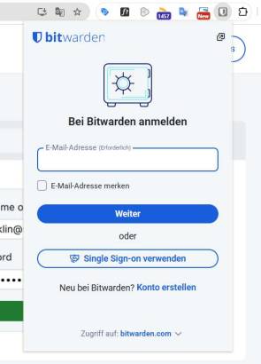 Bitwarden-Erweiterung im Webbrowser. Jetzt suchen Sie die Webseite, auf der Sie sich einwählen möchten. Per Klick öffnet sich die Webseite mit dem Log-in-Fenster. Im Anmeldefenster wird ein kleines, blau-weisses Schild angezeigt. Das bedeutet, dass ein Passwort verfügbar ist Bild 6. Per Klick loggen Sie sich bequem ein.
