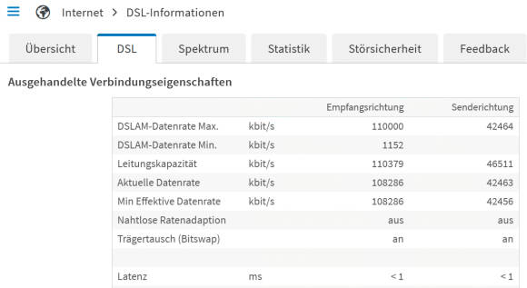 Bild 10: Wichtig ist der Unterschied zwischen DSLAM-Datenrate Max und der Aktuellen Datenrate
