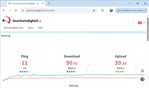 Das Durchführen der Speedtests ist einfach. Rufen Sie zum Beispiel die Internetadresse geschwindigkeit.ch auf und klicken Sie auf Anfang. Der Server führt nun seine Tests durch und zeigt anschliessend die gemessenen Download- und Upload-Werte sowie den Ping, Bild 4. Wenn Sie den Test mehrmals wiederholen, werden Sie feststellen, dass es dabei zu leichten Schwankungen kommt. Falls sie im Bereich von 5 bis 15 Prozent liegen, ist das vollkommen normal. Das Internet ist ein geteiltes Medium.