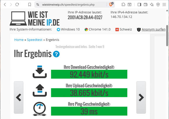 Einer der ältesten Speedtest-Anbieter ist die Webseite wieistmeineip.ch des Axel-Springer-Verlags. Sie bietet nicht nur erweiterte Informationen zu den Tests. Es ist auch möglich, die in Ihrem Provider genannten Leistungswerte vor Beginn der Messungen einzugeben, um sie danach direkt mit den Ergebnissen vergleichen zu können.