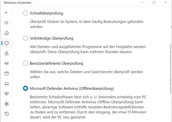 Sowohl in Windows 11 als auch in dem Vorgänger Windows 10 hat Microsoft einen Offline-Virenscan eingebaut, mit dem Sie eine gründliche Suche nach Schädlingen durchführen. Unter Windows 11 rufen Sie das Menü Start/ Einstellungen/Datenschutz und Sicherheit/Windows-Sicherheit/Viren- und Bedrohungsschutz/Scanoptionen auf und wählen danach Microsoft Defender Antivirus (Offlineüberprüfung) aus, Bild 8. Ein Klick auf Jetzt überprüfen startet den Computer neu und führt den Virenscan anschliessend durch. Der Klickpfad in Windows 10 ist nahezu identisch.