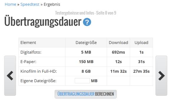 Über die Pfeile nach rechts und links können Sie sich weitere Auswertungen anschauen. Dazu gehört auch eine Einschätzung, wie lange es mit den bei Ihnen gemessenen Werten dauert, einen 8 GB grossen Kinofilm in Full-HD herunter- beziehungsweise hochzuladen, Bild 7. So wissen Sie, wie Ihr Anschluss mit grosse Datentransfers zurechtkommt.