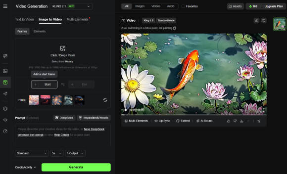 Mit einem Startbild funktioniert es analog. Hier steht Ihnen auch das Modell Kling 2.1 zur Verfügung. Dazu klicken Sie auf die Option Image to Video. Laden Sie Ihr Bild hoch und fügen Sie optional eine Beschreibung dazu, etwa: «A koi swimming in a lotus pond, ink painting».