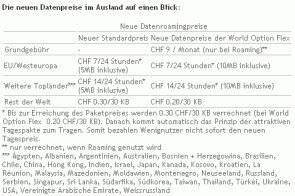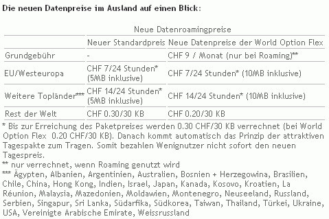 Ab dem 1. Dezember senkt Swisscom die Preise fürs Surfen mit dem Handy im Ausland. Abokunden profitieren neu anstelle eines weltweiten Einheitspreises automatisch von Tagespaketen von 5 MB. Kunden bezahlen beispielsweise im europäischen Ausland für ein Datenpaket von 5 MB nur noch sieben Franken. Die Tagespakete sind jeweils 24 Stunden gültig. Swisscom will mit dem neuen Angebot mobiles Surfen im Ausland zu erschwinglichen Preisen ermöglichen. Die Auslandoption 'World Option Flex' bleibt für Vielsurfer und -telefonierer weiterhin das günstigste Angebot. Diese beinhaltet für Abokunden neu ebenfalls Tagespakete, jedoch mit doppeltem Inklusivvolumen (10 MB). Grundgebühr und Preise für Telefonie oder SMS bleiben unverändert.