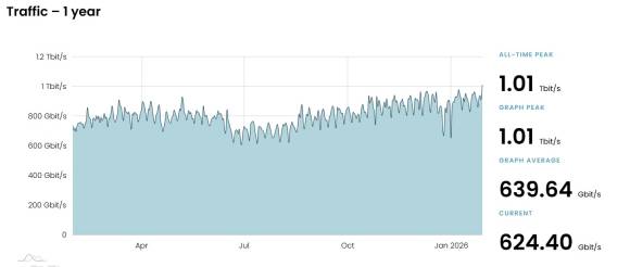 Der historische Peak von 1.01 Terabit pro Sekunde wurde am 28.01.2026 um 21:19 CET gemessen. Damit ist SwissIX – im 25. Jahr seines Bestehens – der 77. Internet-Knotenpunkten weltweit (von über 1’000 existierenden IXPs), der diese Schwelle überschritten hat.