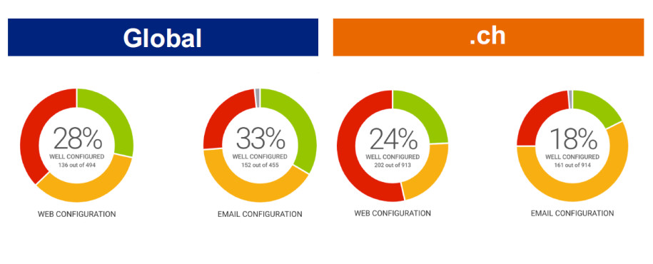 Schlechter bestellt ist es dahingegen um die Mail-Konfigurationen der 1000 beliebtesten Schweizer Domains. Gerade einmal 18 Prozent von diesen können als gut konfiguriert gelten, global liegt die Quote mit 33 Prozent wesentlich höher.