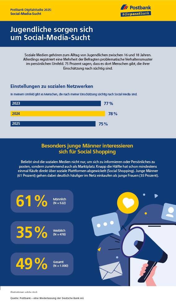 Soziale Medien sind fester Bestandteil des Alltags junger Menschen – zugleich wächst die Distanz. Das ist ein zentrales Ergebnis der „Jugend-Digitalstudie 2025“ der Postbank, für die im September 1.000 Jugendliche im Alter von 16 bis 18 Jahren befragt wurden. Drei Viertel der Befragten geben an, in ihrem Umfeld Freunde zu haben, die sie selbst als abhängig von sozialen Medien einschätzen. Besonders ausgeprägt ist diese Wahrnehmung bei jungen Frauen.