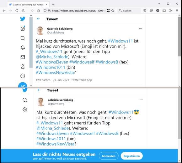 Wenige Minuten danach waren die Herzchen-Gesichter verschwunden! Hat Twitter die Aktion etwa sofort abgeschaltet? Leider nein, denn jetzt sah es aus, als wolle Twitter mich gezielt veräppeln. Die Kollegen versicherten mir, dass sie das Werbe-Emoji bei den #Windows11-Hashtags immer noch sehen.