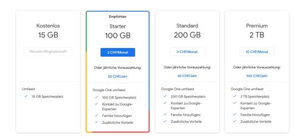 15 GB Speicher sind kostenlos, danach geht es los mit dem Starter-Paket (100 GB Speicherplatz) für Fr. 20.-/Jahr, dem Standard-Paket (200 GB) für Fr. 30.-/Jahr oder dem Premium-Paket (2 TB) für Fr. 100.-/Jahr. Maximal sind 30 TB zu haben. Die komplette Preisliste für den kostenpflichtigen Google-One-Cloudspeicher finden Sie hier.