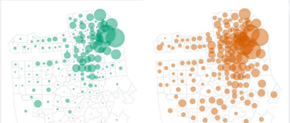 Die Visualisierung der Eincheckdaten (links) und der Kriminalitätsdaten (rechts) stimmen in San Francisco gut überein