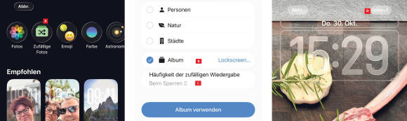 Im nächsten Schritt wählen Sie aus verschiedenen Motiven. Doch um das vorhin angelegte Album auszuwählen, tippen Sie am oberen Rand auf Zufällige Fotos A. Wählen Sie anschliessend das frischgebackene Album aus B und bei welcher Gelegenheit die Motive wechseln sollen C. Mit einem Tippen auf Album verwenden wird die Auswahl bestätigt.