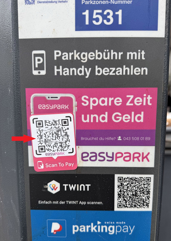 In diversen Schweizer Städten sind im Jahr 2024 erstmals gefälschte QR-Codes an Parkuhren aufgetaucht. Die Betrüger überkleben den Original-QR-Code mit einem Fake-Code, der zu Phishing-Websites führt. Dort werden Nutzern Kreditkarten- oder Log-in-Daten entlockt. Die Schweizer Stadtpolizeien entfernen solche Fälschungen konsequent.