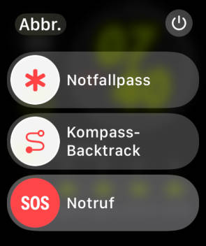 Tipp: Um einen Notruf manuell abzusetzen, wird die Seitentaste der Apple Watch etwa zwei Sekunden lang gedrückt, bis der Schieberegler Notruf eingeblendet wird, Bild 2.