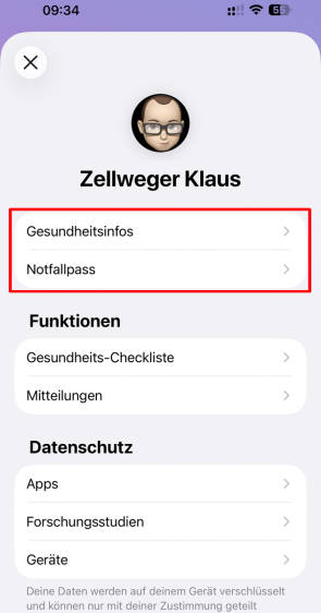 All diese Angaben werden nicht an der Apple Watch, sondern in der Health-App am iPhone erfasst. Tippen Sie ganz rechts oben auf das Profilbild. Im nächsten Fenster werden ganz oben die Bereiche Gesundheitsinfos und Notfallpass eingeblendet, Bild 3. In den Einstellungen zum Notfallpass müssen zudem oben die beiden Optionen Im Sperrzustand zeigen und Während des Notrufs teilen aktiviert sein, damit die Helfer schnell darauf zugreifen können.