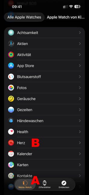 Aktivierung: Die Überwachungsfunktionen der Apple Watch werden zentral am iPhone aktiviert, und zwar in der Watch-App. Tippen Sie am unteren Rand auf den Bereich Meine Watch, Bild 4 A, und anschliessend auf den Eintrag Herz B.