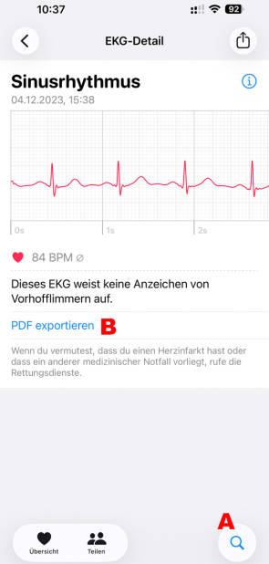 Jedes angefertigte EKG wird in der Health-App auf dem iPhone gespeichert. Diese Aufzeichnungen sind besonders wertvoll, um episodische Rhythmusstörungen zu dokumentieren, die beim Arztbesuch möglicherweise nicht auftreten. Um die Messergebnisse anzuzeigen oder sie als PDF-Dokument an den Arzt weiterzuleiten, öffnen Sie am iPhone die Health-App. Tippen Sie unten rechts auf die Lupe, Bild 7 A, und geben Sie den Begriff EKG ins Suchfeld ein, um die letzten Messungen anzuzeigen. Tippen Sie anschliessend auf einen Eintrag und danach auf den Befehl PDF exportieren B, um ein PDF anzufertigen.