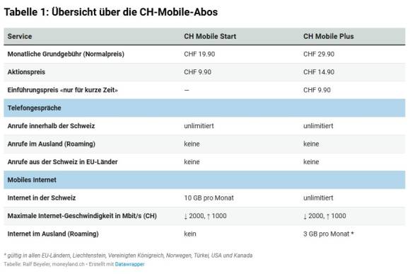 Der reguläre Preis von CHmobile Start beträgt 19.90 Franken pro Monat. Aktuell ist das Abo für 9.90 Franken zu haben. Das umfangreichere Abo CHmobile Plus kostet regulär 29.90 Franken pro Monat. Aktuell ist es auch für 9.90 Franken zu haben. Jetzt buchbar auf www.chmobile.ch