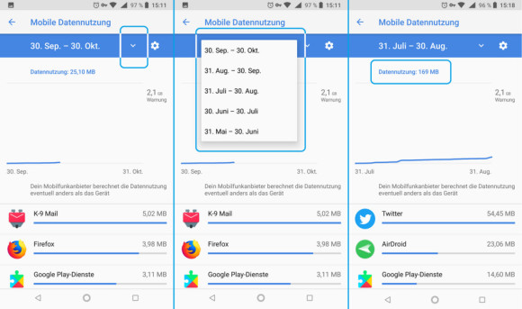 Es erscheint zunächst die Anzeige für den laufenden Monat. Es interessieren Sie aber vermutlich eher die letzten paar abgeschlossenen Monate. Tippen Sie das unscheinbare Ausklappmenü neben der Zeitraumangabe an. Hier finden Sie Einträge der letzten Monate. Tippen Sie einen Eintrag an, zeigt er Ihnen die in jenem Monat verbrauchte Datenmenge.