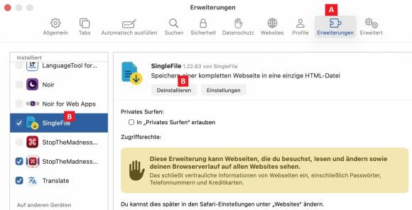 Die Anwendung respektive Erweiterung wird aus dem Mac App Store geladen. Nach der Installation starten Sie Safari. Öffnen Sie in den Einstellungen den Bereich Erweiterungen, Bild 1 A, und aktivieren Sie SingleFile mit allen Rechten B. Denn die Funktion bedingt, dass die Erweiterung alle Websites lesen kann.