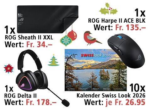 Im Adventskalender 2025 verlosen die Kollegen vom PCtipp auch dieses Jahr wieder tolle Preise. Dazu gehören die 10 Swiss Look 2026-Kalender sowie ein ROG Sheath II XXL Mouse Pad, eine ROG Harpe II Ace Gaming Mouse und ein ROG Delta II Headset.