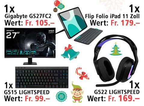 Im Adventskalender 2025 verlosen die Kollegen vom PCtipp auch dieses Jahr wieder tolle Preise. Dazu gehören der Gaming-Monitor Gigabyte GS27FC2, die Tastatur Flip Folio iPad 11 Zoll, die Gaming-Tastatur G515 LIGHTSPEED und das Gaming-Headset G522 LIGHTSPEED.