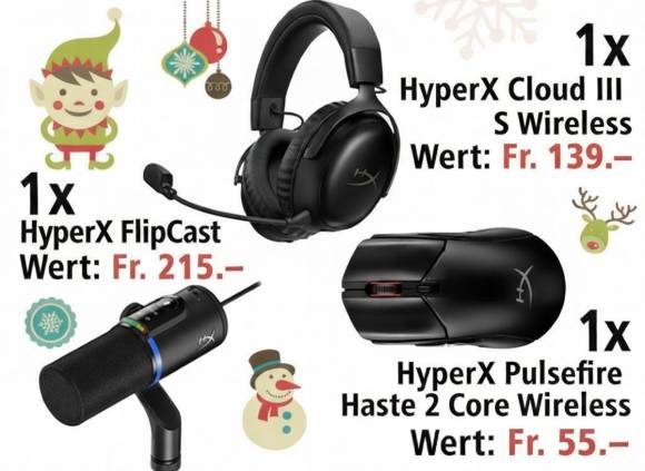 Im Adventskalender 2025 verlosen die Kollegen vom PCtipp auch dieses Jahr wieder tolle Preise. Dazu gehört das HyperX-Bundle. Es besteht aus dem Headset HyperX Cloud III S Wireless, der Maus HyperX Pulsefire Haste 2 Core Wireless und dem Mikrofon HyperX FlipCast.