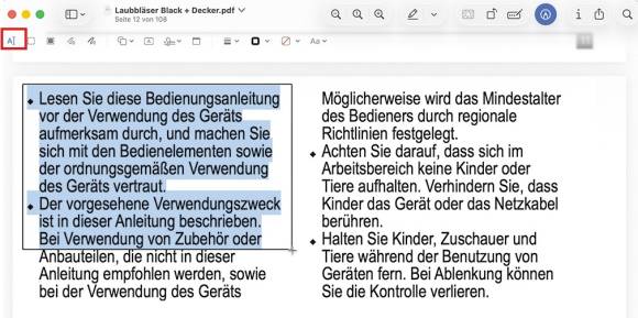Die einfachste Abhilfe: Wählen Sie in der Vorschau ganz links oben wie gewohnt das Werkzeug für Textmarkierungen. Halten Sie die Option-Taste gedrückt und ziehen Sie ein Rechteck auf. Damit wird nur dieser Text markiert – und bei Bedarf kopiert.