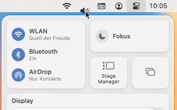 Genauso einfach sind neue Einträge: Öffnen Sie das Kontrollzentrum und ziehen Sie das gewünschte Symbol in die Menüleiste, so wie im Beispiel unten der Ton.